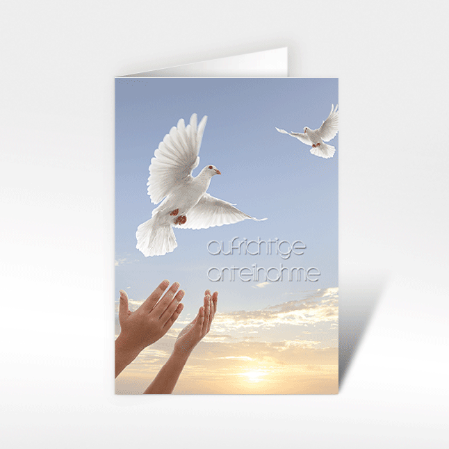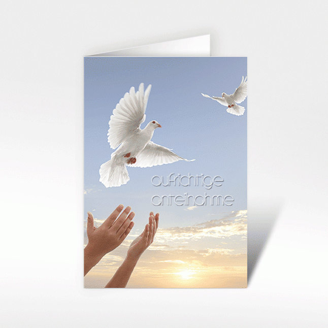 Design: "Loslassen" fliegende Tauben am Himmel. Format: A6 hoch (10.5 x 14.8 cm), inkl. Standard-Couvert weiss C6