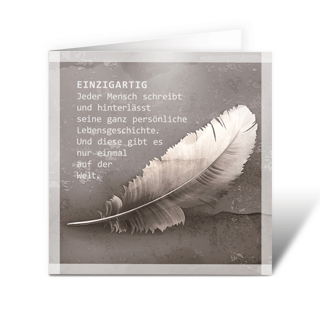 Design: "Die Lebensgeschichte" mit Feder und Text. Format: 15 x 15 cm, inkl. Standard-Couvert weiss 15.5 x 15.5 cm