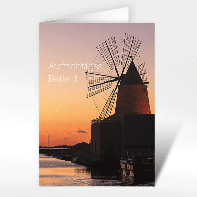 Design: "Stiller Wind" mit Windmühle am Fluss. Format: A5 hoch (14.8 x 21 cm), inkl. Standard-Couvert weiss C5